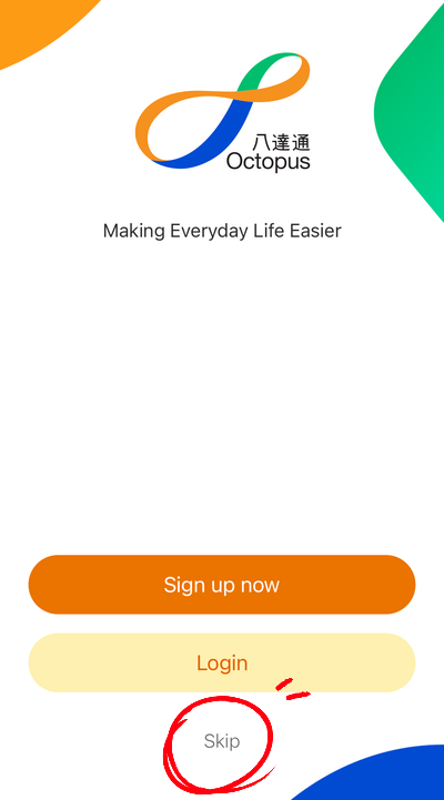 Octopus八達通 앱을 설치하고 열어주세요. 제일 밑에 Skip 버튼을 누릅니다.
