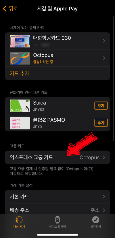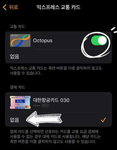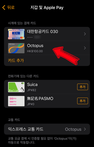 이렇게 하면 아이폰/애플워치를 개찰구에 찍을 때 옥토퍼스 카드가 교통카드로 찍히고 신용카드는 찍히지 않으니 안심하세요.