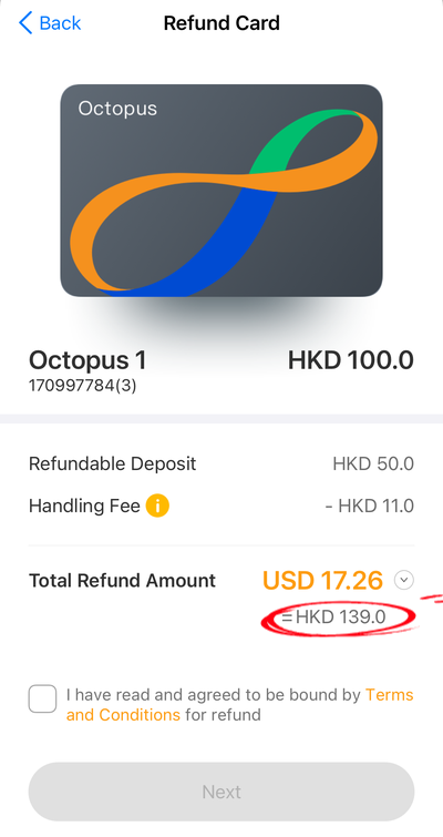 잔액이 HKD100이라면 보증금 50까지 합치면 150이죠? 여기서 수수료 $11을 제외하고 환불받을 수 있어요.