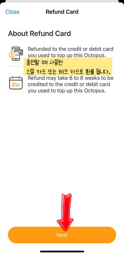 환불은 충전할 때 사용한 신용 카드 즉 애플 페이에 등록한 카드로 환불됩니다. 환불까지는 6~8주 소요.