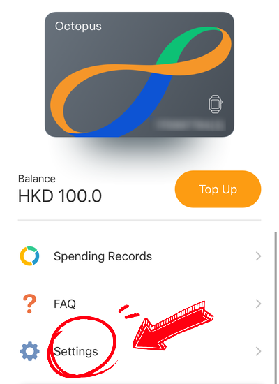 투어리스트 옥토퍼스 카드 앱으로 들어갑니다. 첫 화면에서 Settings를 눌러요.