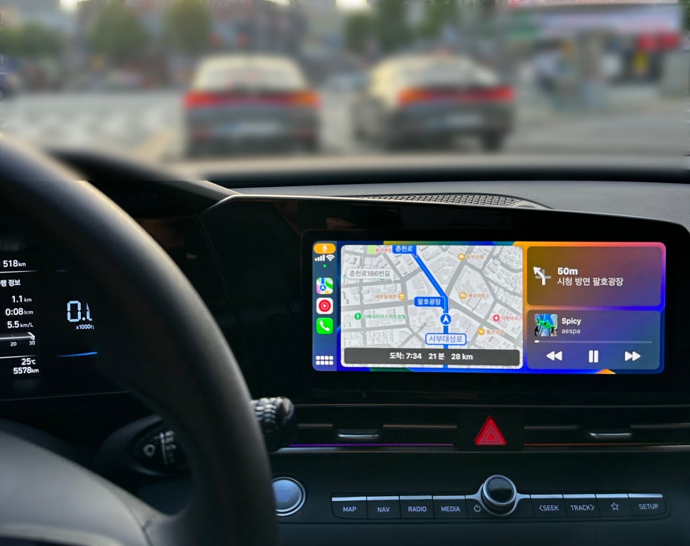 현대차, 기아차는 길쭉한 디스플레이를 자동차 내부에 채택하고 있기 때문에 좌측 65% 정도 크기를 내비게이션에 우측 35% 나머지 크기를 음악, 날씨 등 기타 공간에 할애하며, 공간 낭비를 최소화하는 모습을 보여왔습니다. 이런 커스텀이 마음에 들진 않지만, 몇 시간 빌리는 쏘카 더뉴아반떼CN7 이기 때문에 저 역시, 뭐 하러 굳이 안드로이드 오토 / 애플 카플레이를 쓰냐. 대충 현대 블루링크를 쓰면 되지~라는 생각으로 미뤄오기도 하였습니다.