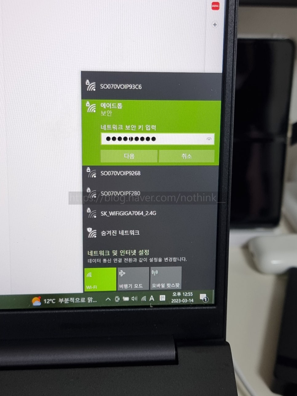 그리고 핫스팟을 연결하고자 하는 기기 와이파이 목록에서 아이폰 이름을 선택하고 비밀번호를 입력합니다.
