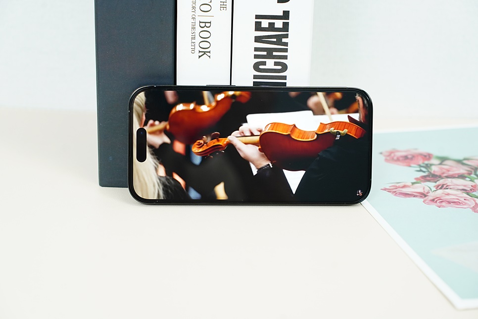 힐링쉴드 아이폰14 프로 초슬림 플렉시블 3D 풀커버 강화유리 액정보호필름을 부착한 상태입니다.