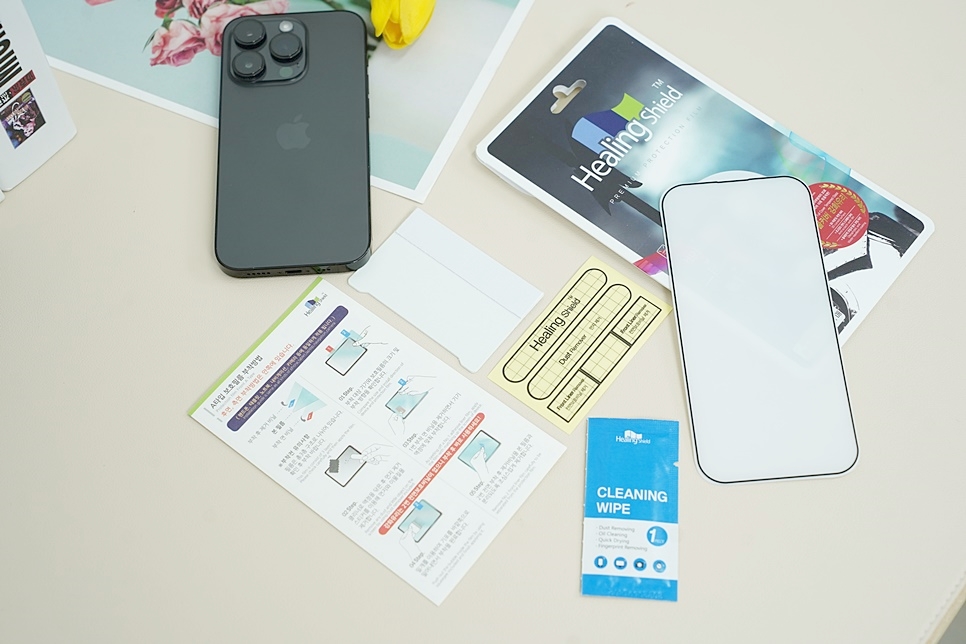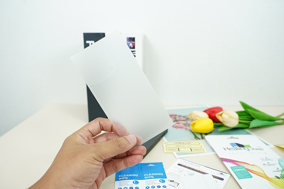 힐링쉴드 제품은 필름에 따라 약간의 차이는 있지만 기본적으로 강화유리 or 보호필름과 먼지제거 스티커, 밀대, 클리닝 와이프, 부착방법 설명서가 들어 있습니다.