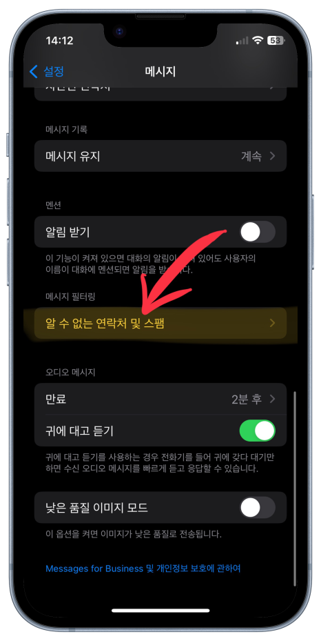 [스미싱 메시지 필터링 기능] 설정 방법은 아이폰 [설정] 메뉴에서 [메세지] -> [알 수 없는 연락처 및 스팸] 으로 들어가 [알 수 없는 발신자 필터링하기] 를 활성화 해주시고 [SMS 필터링] 에서 [피싱아이즈] 어플을 활성화 해두시면 스미싱 메세지를 필터링 해주게 됩니다.