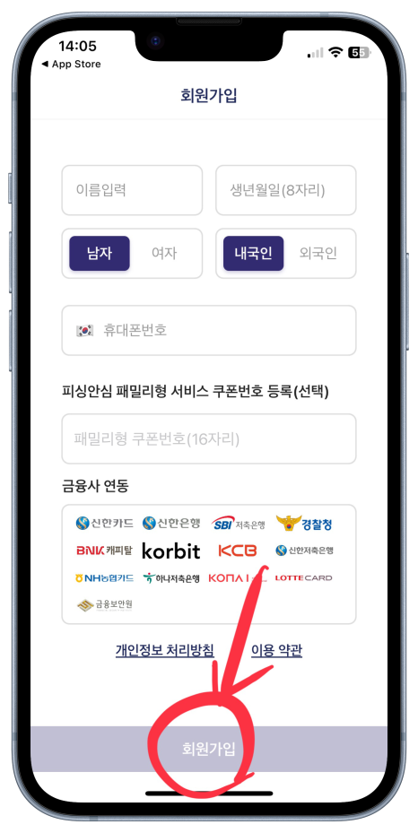 검색된 피싱아이즈 앱을 선택하여 다운로드하고 설치한 후 앱을 실행하여 회원가입 절차를 따라 개인 정보를 입력하여 가입을 완료합니다.