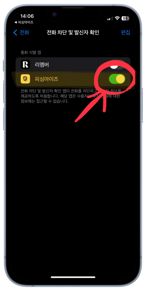 [보이스피싱 의심 전화 알림] 설정 방법은 아이폰 [설정] -> [전화] 로 들어가 [전화 차단 및 발신자 확인] 메뉴를 선택한 후 [피싱아이즈] 앱을 활성화 해주시면 됩니다.