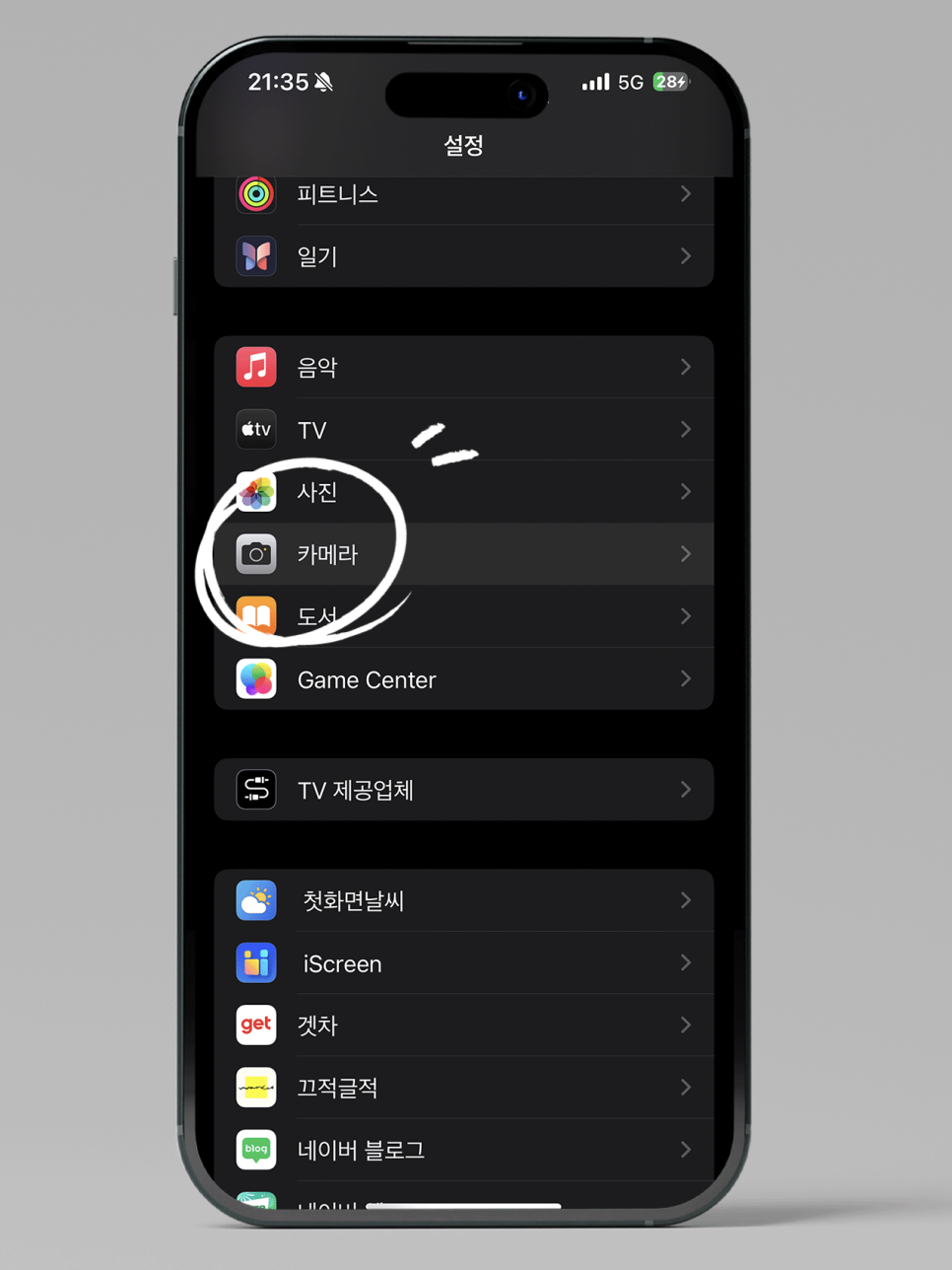 '설정'으로 이동한 후 '카메라'를 선택합니다.