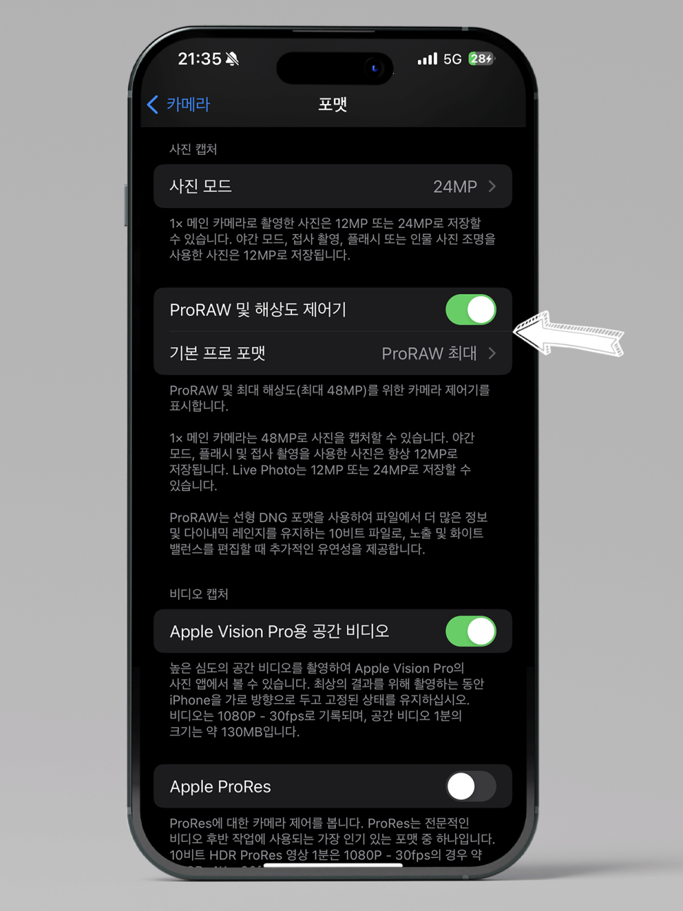 'ProRAW' 및 해상도 제어기 옵션을 활성화합니다.