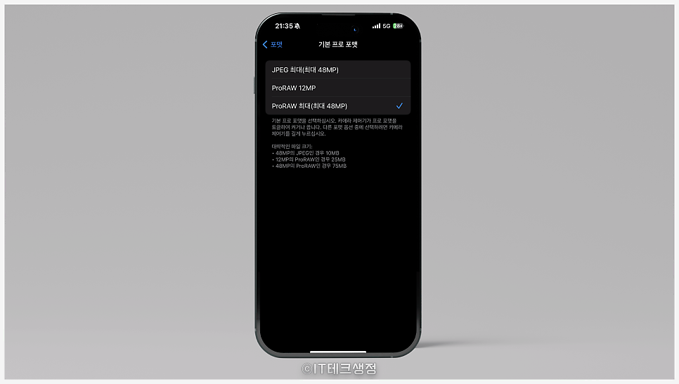 여기서 세 가지 옵션 중 하나를 선택할 수 있습니다: HEIF 최대 (48MP까지), ProRAW 12MP, 또는 ProRAW 최대 (48MP까지). 이 선택은 품질과 파일 크기의 균형을 맞추는 데 중요합니다.