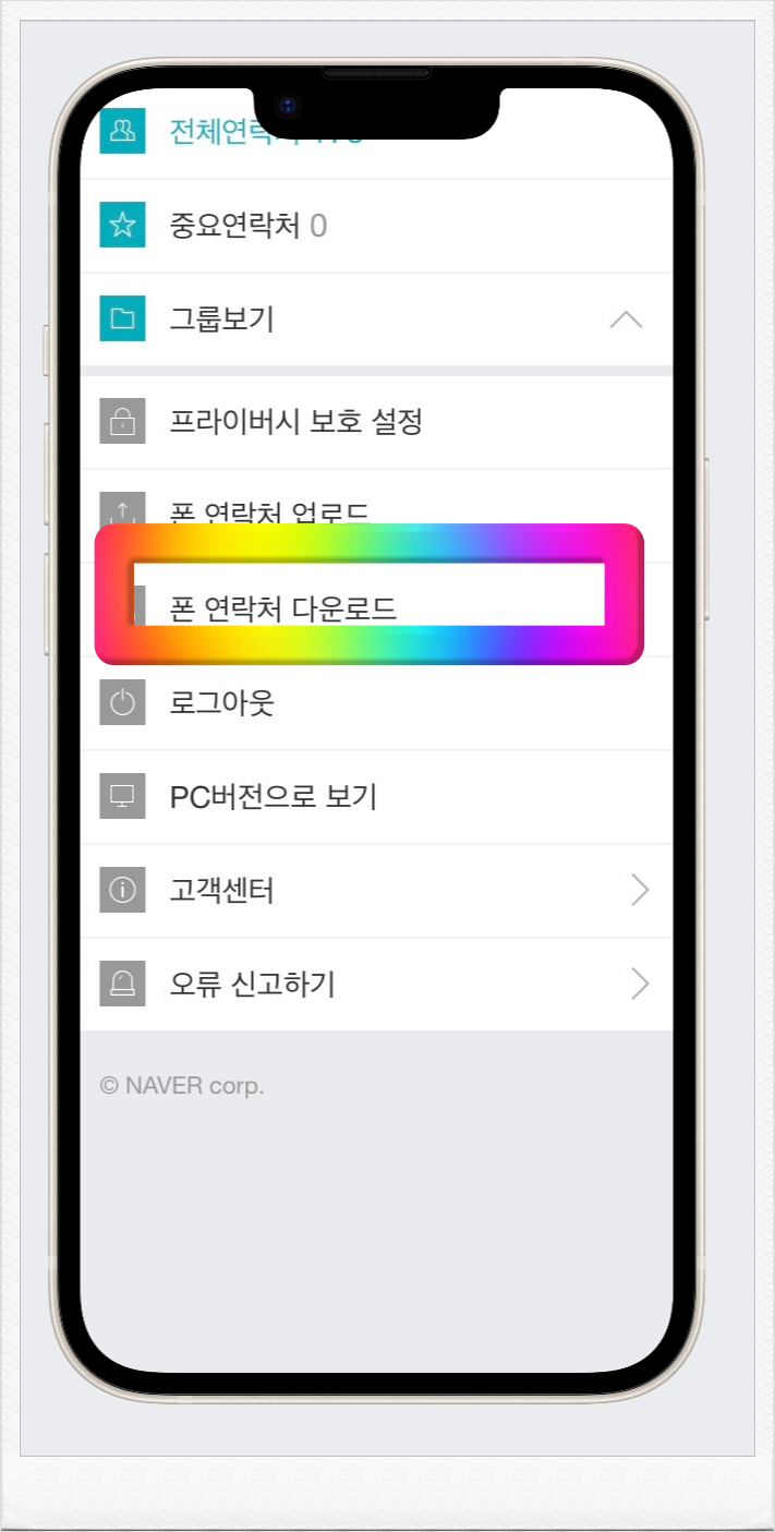 4. 그러면 진짜 끝입니다. 바로 내 연락처를 불러오고 있어요 라는 화면이 뜨게 됩니다. 이렇게 연락처를 다 옮기셨으면, 새로운 핸드폰에서 그냥 다운로드해 주시면 됩니다. 우측 상단에 있는 막대기 3줄 버튼을 클릭한 다음, 폰 연락처 다운로드를 클릭해 주시면, 아이폰에 있는 연락처를 옮기실 수 있습니다.