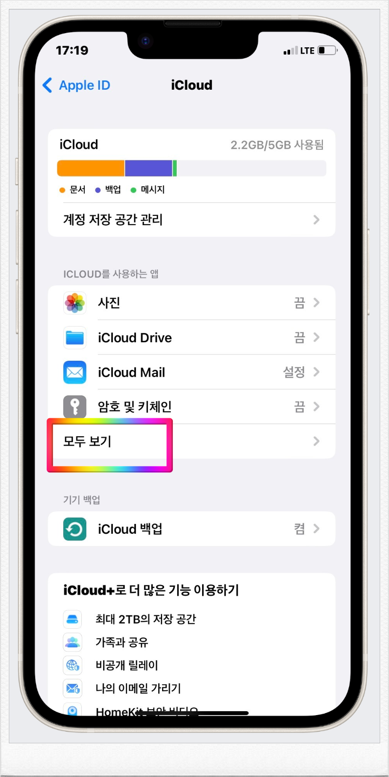 3. 기본적으로 아이클라우드(iCloud)에서는 5GB까지만 Free로 사용할 수 있지만, 보통 용량은 사진이 많이 차지하고 있기 때문에 용량이 작은 번호는 용량 걱정 안 하셔도 될 것 같습니다. 그래서 아이클라우드(iCloud)를 들어가 보시면 다음과 같은 화면이 나오게 됩니다. 여기서 '모두 보기'를 클릭해 주세요.