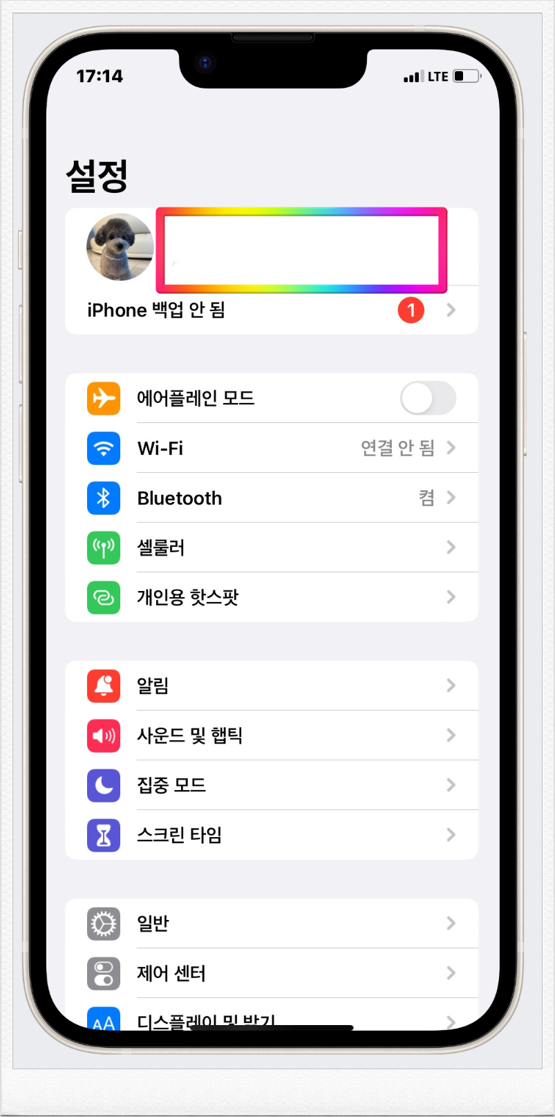 1. 우선 현재 본인이 가지고 있는 아이폰에서 다른 아이폰으로 연락처 내보내기를 할 수 있는 방법에 대해서 말씀드리도록 하겠습니다. 설정에서 본인 아이디(빨간 네모 박스)를 눌러주세요.