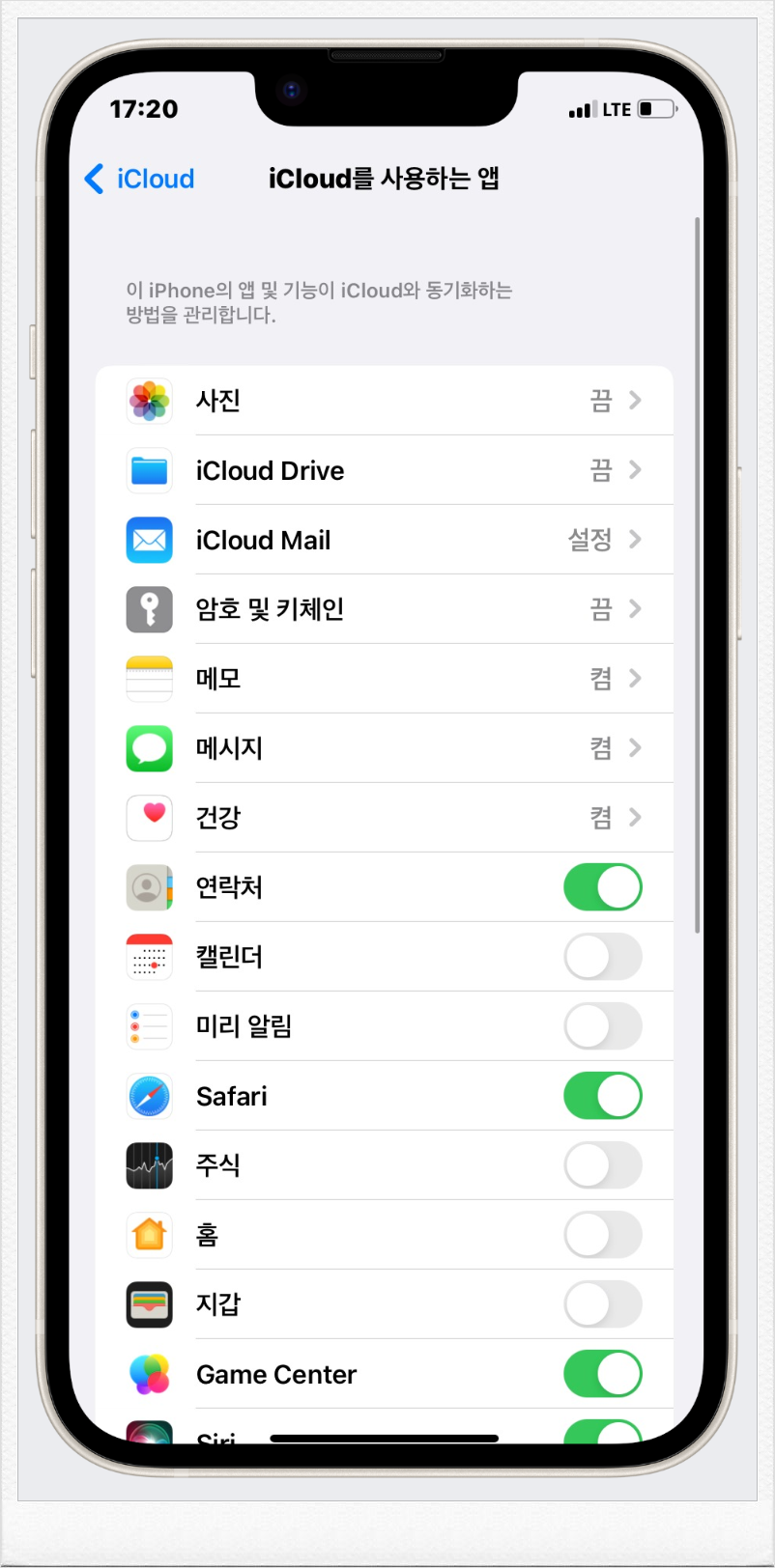 4. 그러면 다음과 같이 아이클라우드(iCloud)를 사용하는 앱 목록을 확인하실 수 있습니다. 여기서 저는 연락처를 활성화 해두었는데요. 새로운 아이폰을 사용하시는 사람들에게는 이렇게 활성화하는 경우 새로운 아이폰과 기존 아이폰의 연락처를 동기화할 것인지에 대한 탭이 뜨게 됩니다. '병합 or '취소'를 할 수 있는 창이 뜨게 되는데 여기서 '병합'을 눌러주시면 기존 기기와 현 기기에 있는 것을 합쳐줄 수 있게 됩니다.