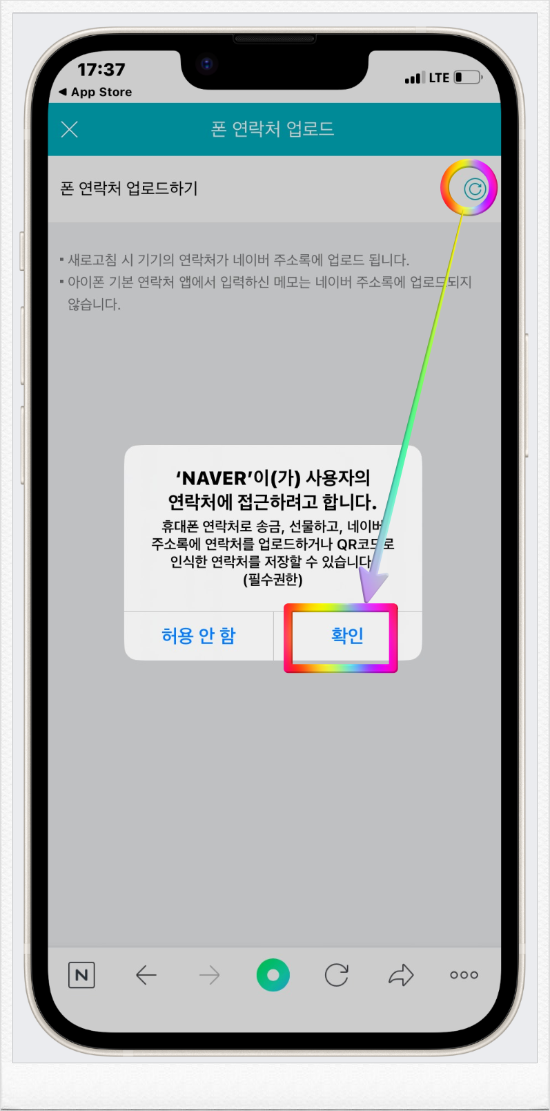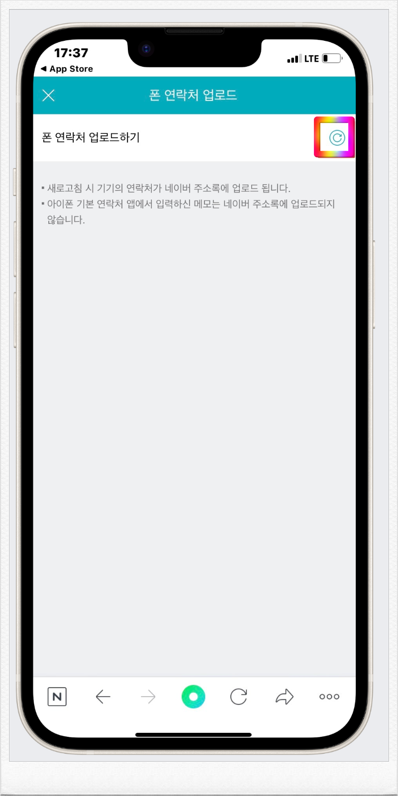 3. 그러면 아래와 같은 화면이 나오게 되는데요. 우측에 있는 새로고침 버튼을 클릭하게 되면 아이폰에 있는 번호가 주소록으로 옮겨지게 되는 것입니다. 새로고침 버튼을 클릭하시면 다음과 같이 에서 아이폰 연락처에 접근을 해도 되는지에 대한 승인 알림이 뜨는데, 확인을 클릭해 주세요.
