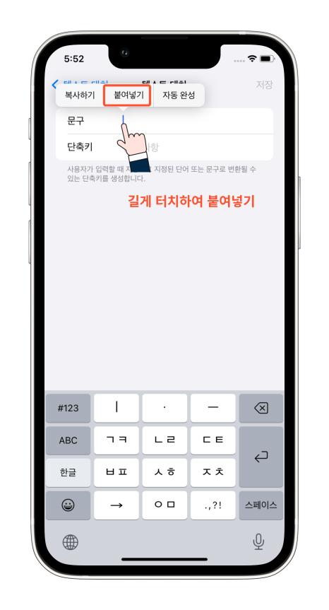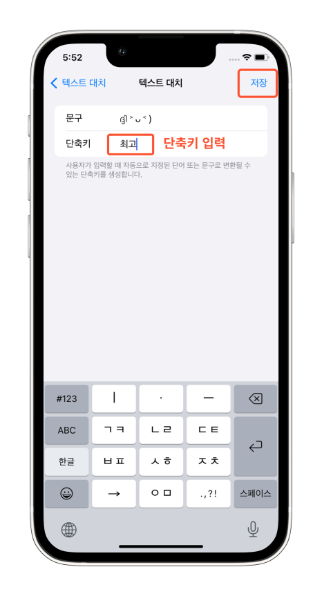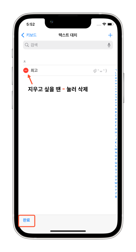 내가 사용할 단축어를 입력하고 저장을 누르고 완료 버튼을 눌러주세요. 만약 지우고 싶을 땐 왼쪽 빨간색 - 아이콘을 눌러 삭제해 주면 됩니다.