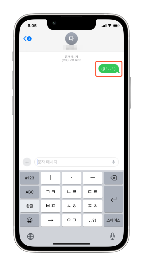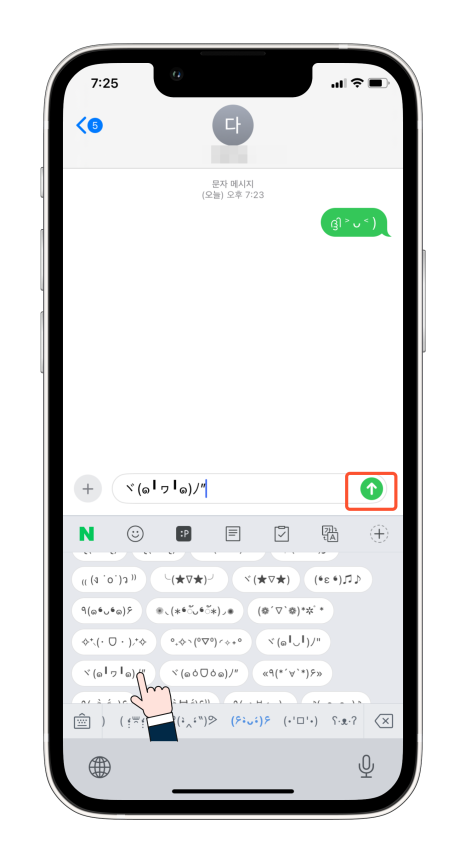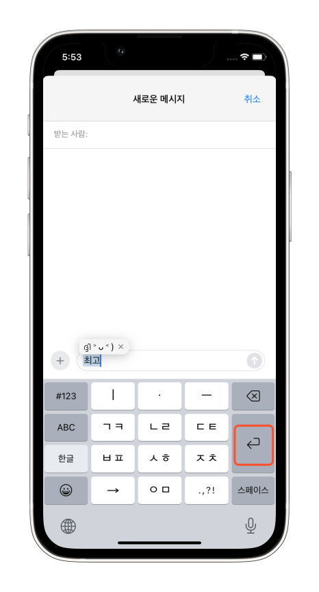 만든 단축어를 이용해 보기 위해 저는 문자 앱을 이용했어요. 메시지 보내기에서 글자 입력창에 이모티콘의 단축어인 최고를 입력하면 글자 윗부분이나 아랫부분에 설정한 이미지가 나타나고 엔터키를 눌러주면 글자가 그림으로 바뀌게 되고 보내기를 눌러주면 됩니다.