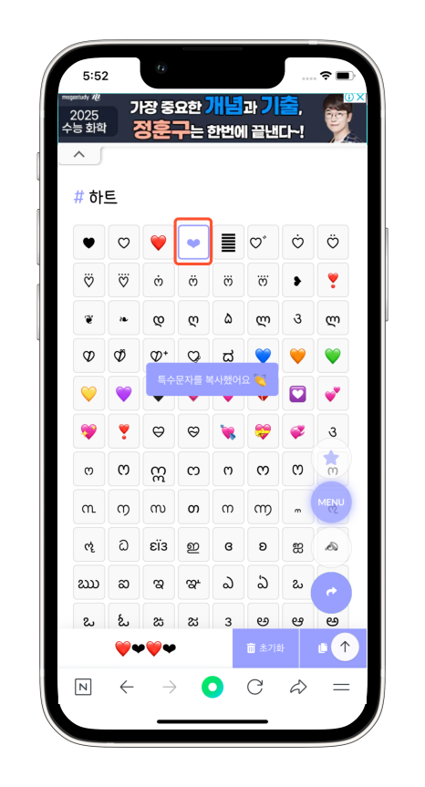 하트모양도 위에서와 마찬가지로 특수문자로 검색을 하면 하트를 선택하고 터치하여 모양을 복사해요. 같은 방법으로 텍스트 대치에 추가해 주면 사용 가능합니다.