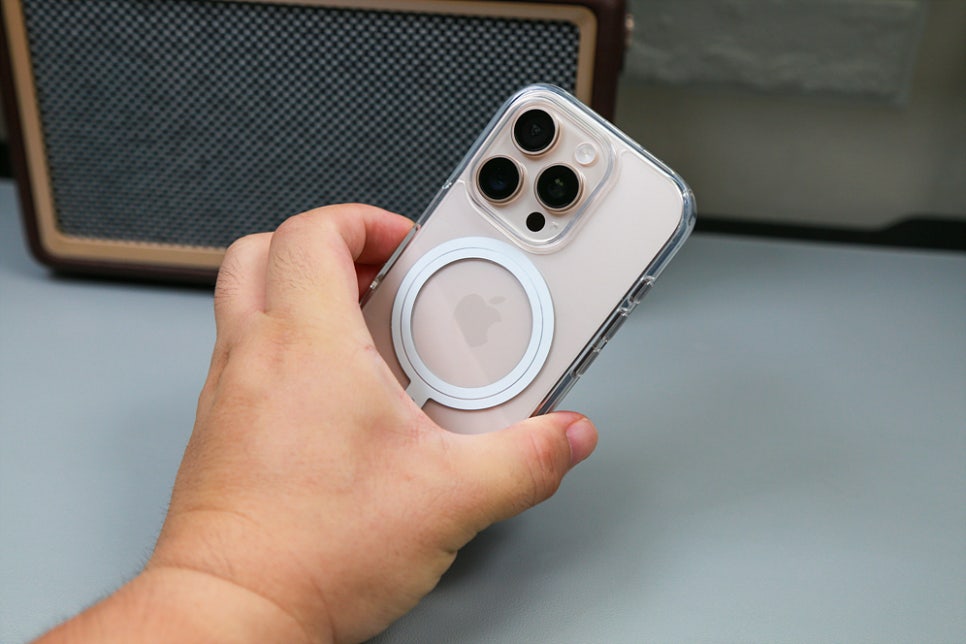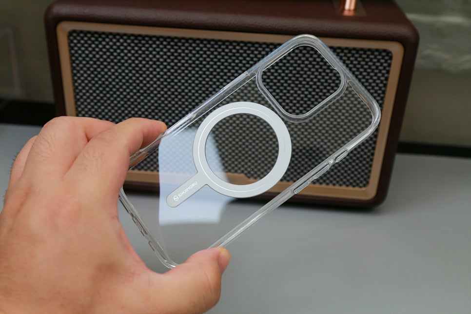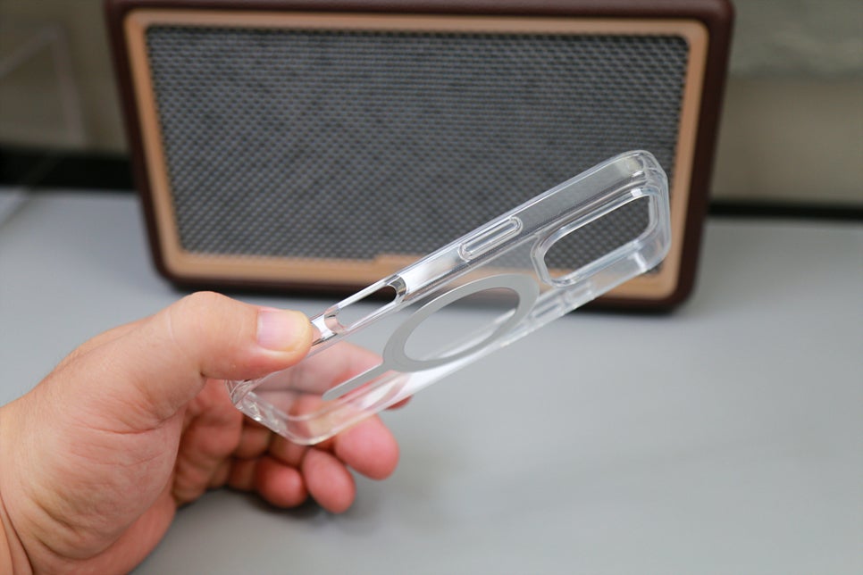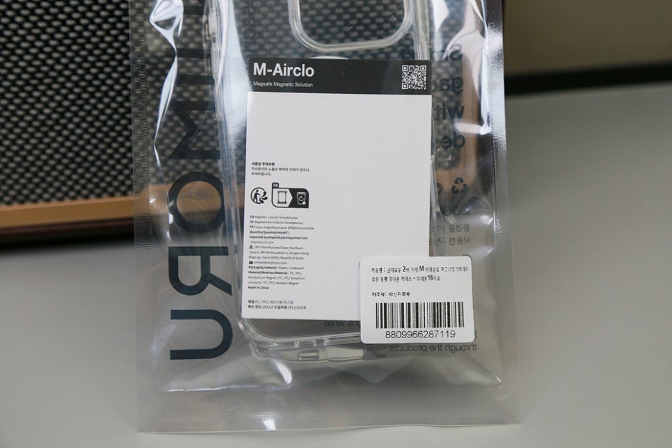먼저 마그네틱 M 에어클로 투명 케이스는 PC와 TPU 두 가지 소재를 결합한 제품으로 테두리는 충격 흡수를 해주는 TPU 후면은 충격을 보호하고 변색이 없는 PC 소재를 적용했습니다. 강력한 자력을 제공하는 맥세이프 케이스로 UV 코팅을 하여 지문 방지 기능도 탑재되어 있습니다.