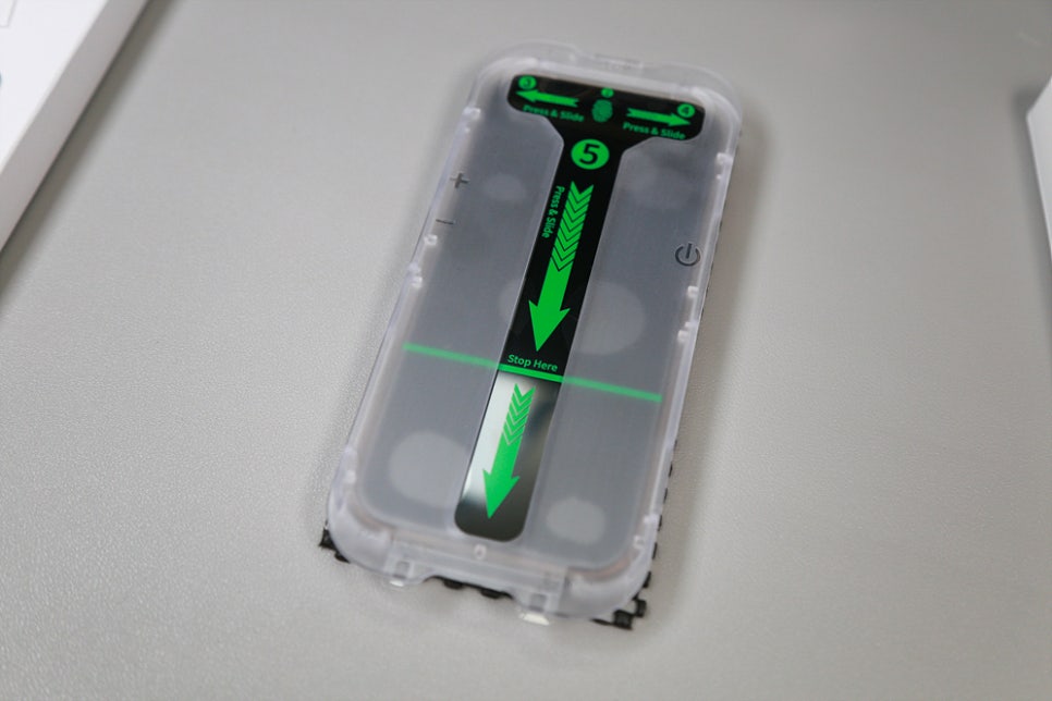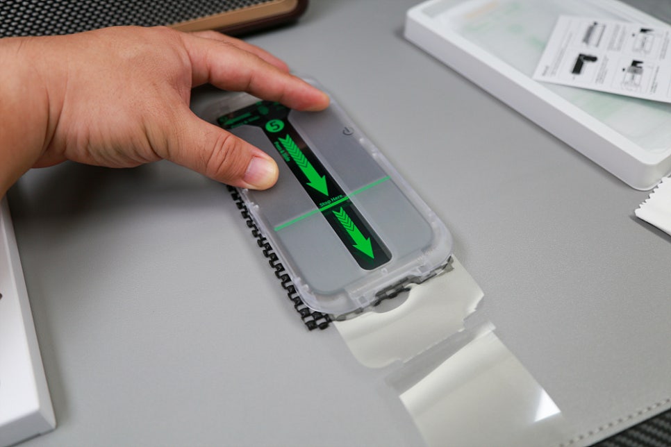 모든 준비를 마쳤다면 신지모루 글라포스 강화유리 액정보호 필름이 들어 있는 아이폰 위에 어플리케이터를 덮어줍니다. 그리고 1번 필름을 중간의 녹색 표시선까지 화살표 방향대로 당겨줍니다. 2번 부분을 손가락으로 누르면서 나머지 부분을 그대로 당겨줍니다.