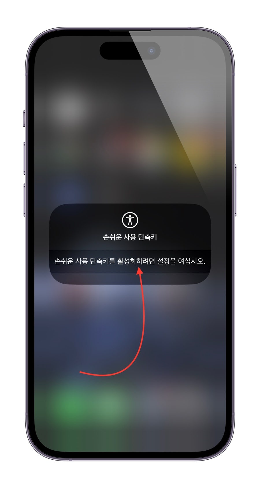 그럼 제어 센터 화면 하단에 사람 모양의 아이콘이 생성되신 게 보이실 겁니다. 터치해 주세요. 그럼 활성화를 위한 설정을 하라는 문구가 보이실 겁니다. '손쉬운 사용 단축키를 활성화하려면 설정을 여십시오'라는 문구를 터치해 주세요.