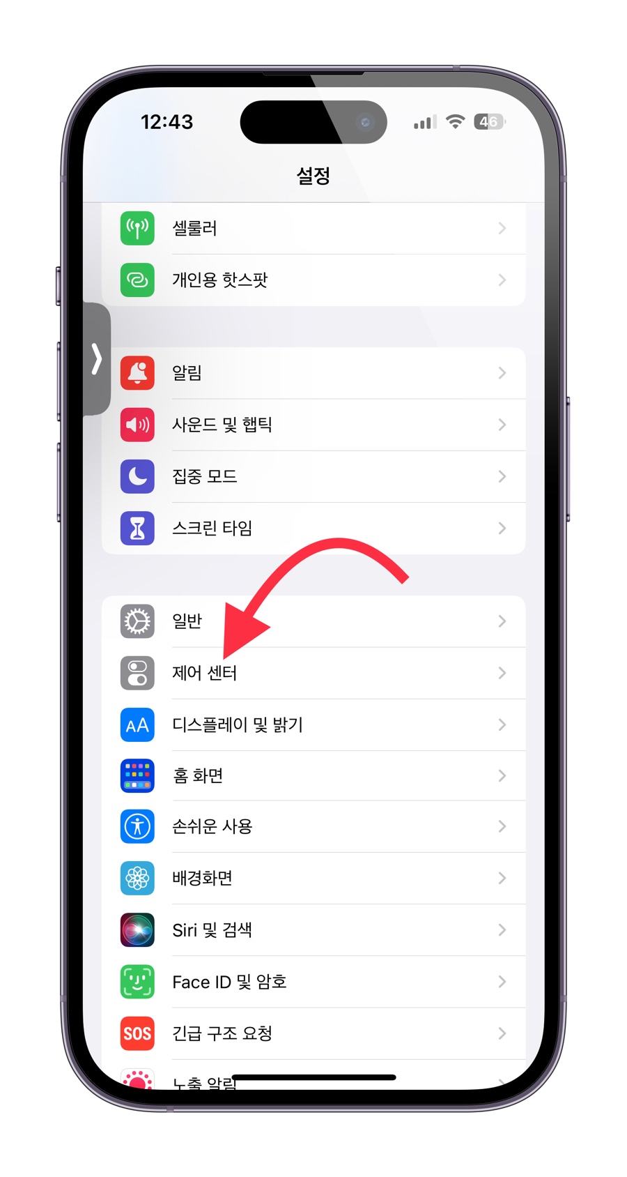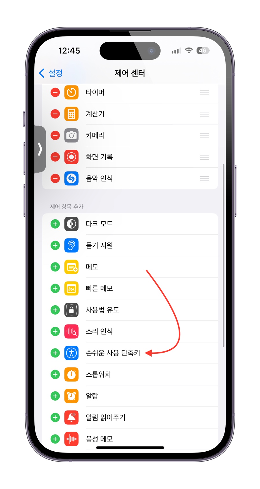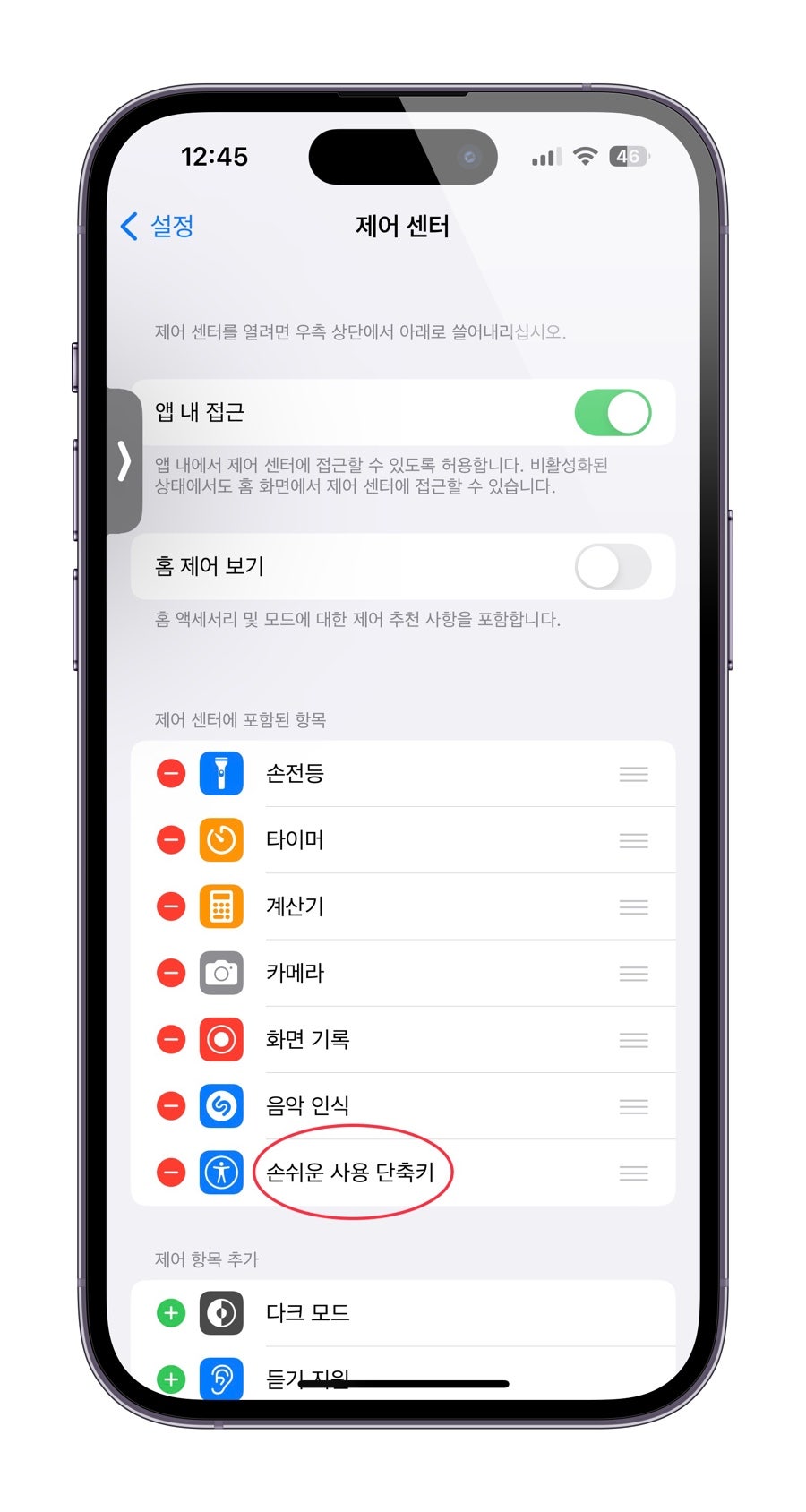화이트 포인트 줄이기 설정을 더 편하게 설정하는 방법은 바로 제어센터를 통해서 사용하는 방법인데요. 한번 자세히 알아보겠습니다. 우선 설정으로 들어가셔서 하단으로 드래그하시면 '제어 센터'메뉴가 보이실 겁니다. 선택해 주세요. 그리고 하단으로 내려보시면 제어 항목을 추가할 수 있는 리스트가 보이실 겁니다. 이 중에서 '손쉬운 사용 단축키'를 찾아서 앞 부분에 플러스 버튼을 눌러서 추가해 주세요.