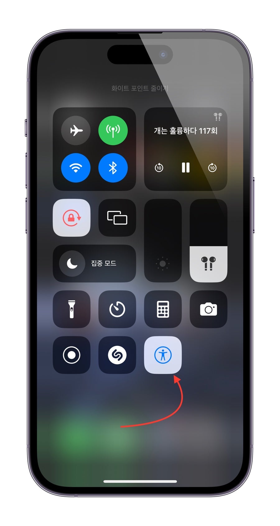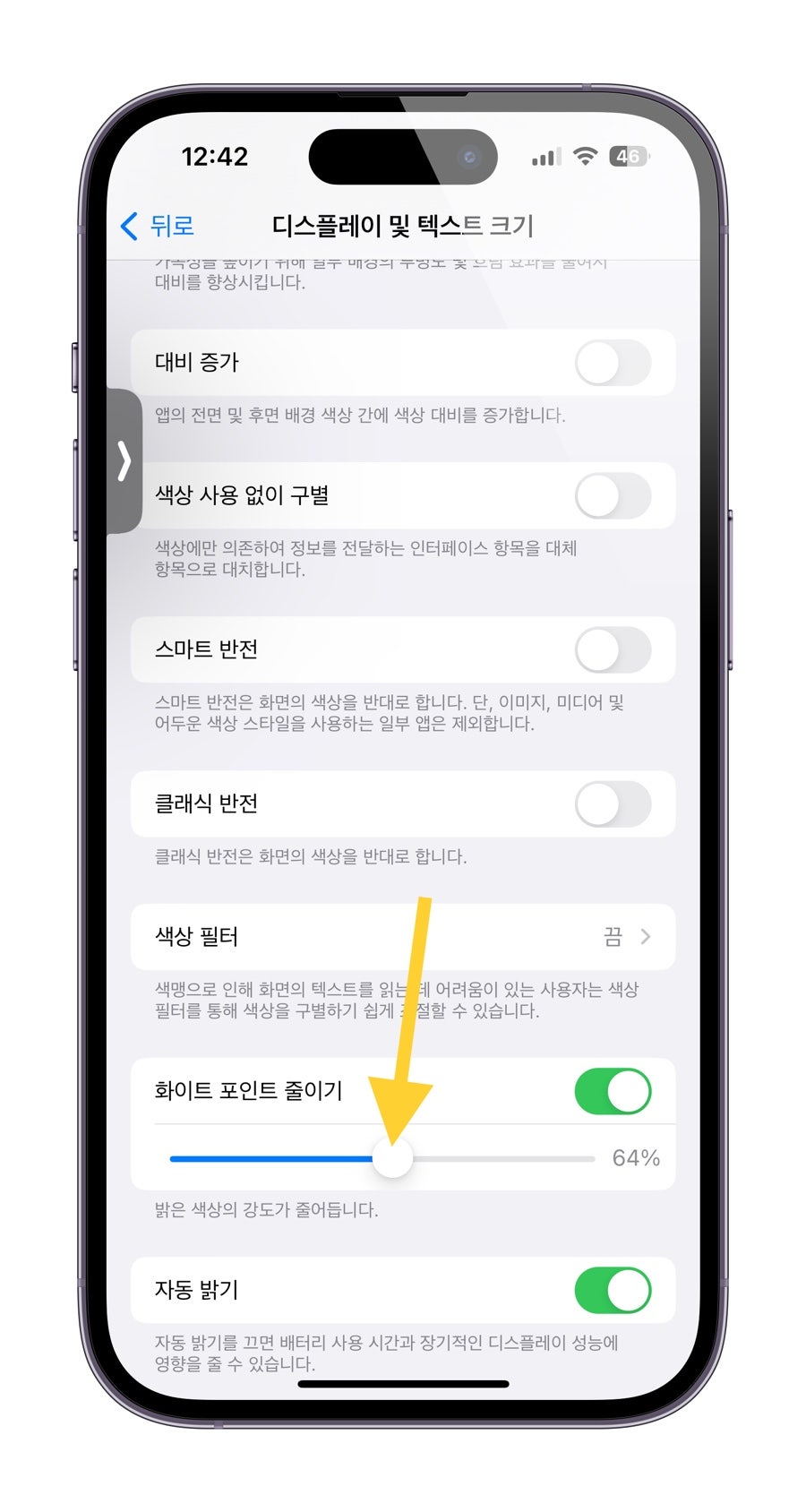 그리고 하단으로 내려 보시면 (화이트 포인트 줄이기) 항목이 보이실 겁니다. 우측으로 비활성화되어 있으실 텐데요. 이 부분을 터치하셔서 활성화시켜 주시면 바로 하단으로 강도를 조절할 수 있는 조절바가 나타나실 겁니다. 이 조절 바를 조절하셔서 제일 본인에게 원하는 강도로 조절을 해 주세요. 이렇게 아이폰 화면 밝기 더 어둡게 낮추기 방법은 완료가 되었습니다. 이제 제법 어두워지셨을 겁니다. 하지만 매번 이렇게 메뉴를 찾아 들어가는 건 번거로우실 겁니다. 그래서 자주 사용하신다면 편하게 사용하는 방법 알려드릴게요.