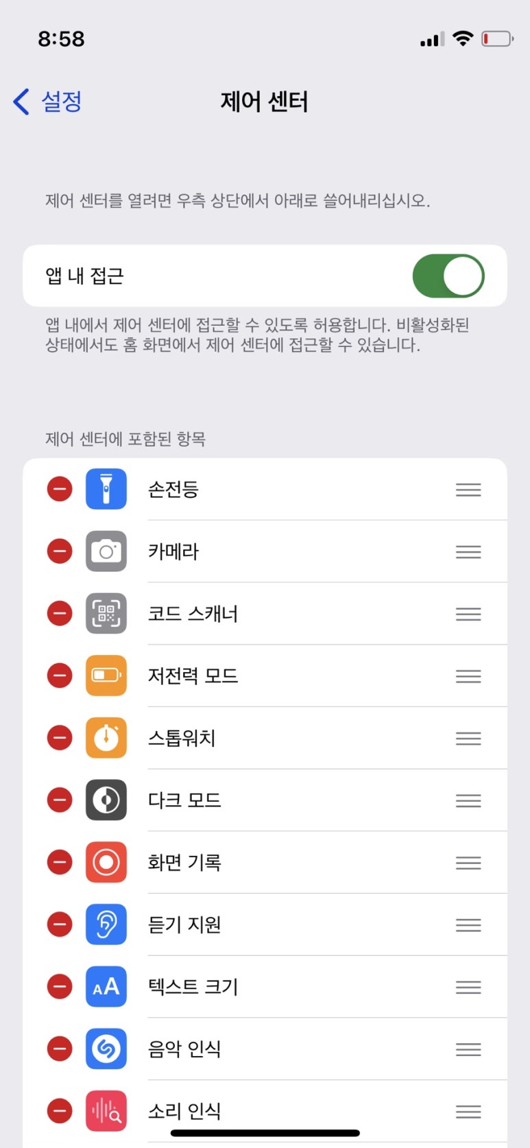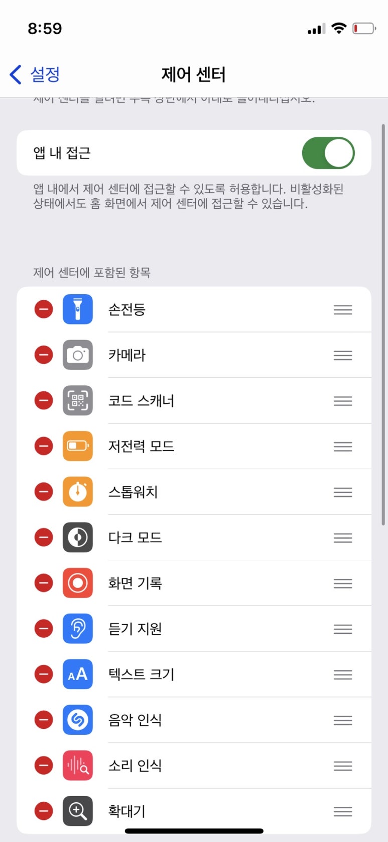 그러면 여기서 제어센터에서 어떤기능을 사용할지 설정할 수 있습니다.
