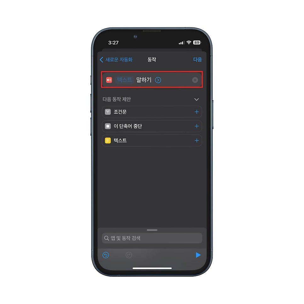 그럼 위 사진과 같은 화면이 나오실 텐데 "텍스트 말하기" 탭을 클릭해 아이폰 충전음으로 설정하고자 하는 텍스트를 입력해 주시면 돼요. 필자는 "야호 밥이다"라는 귀여운 문구를 한번 넣어볼게요. 여러분들도 원하시는 아이폰 충전 단축어를 입력해 주시면 됩니다. 입력하셨다면 우측 상단의 다음을 눌러주세요.