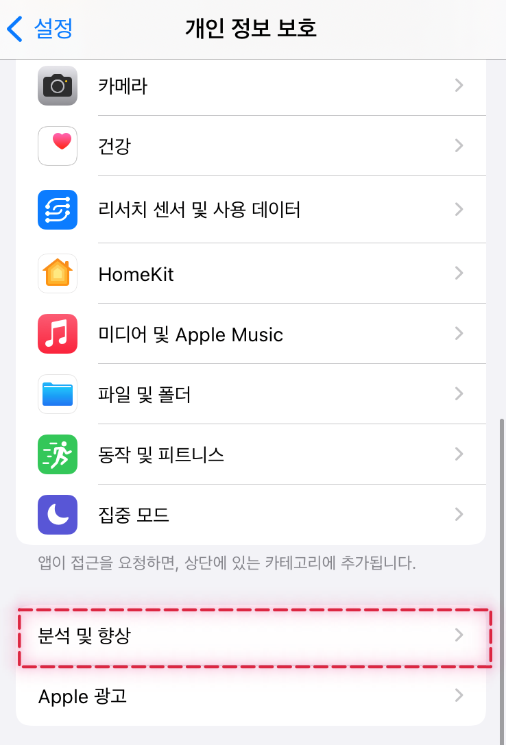 아이폰 설정 --> 개인정보 보호 --> 분석 및 향상 --> iPhone 및 Watch 분석 공유