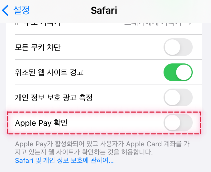 아이폰 설정 --> Safari --> 개인 정보 보호 및 보안 - Apple Pay 확인