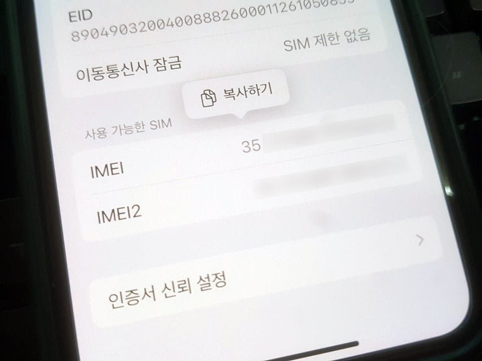 EID, IMEI 1,2 그리고 MEID 이렇게 나와 있습니다.