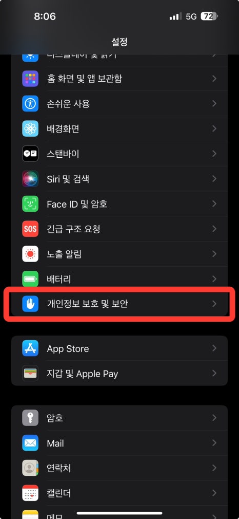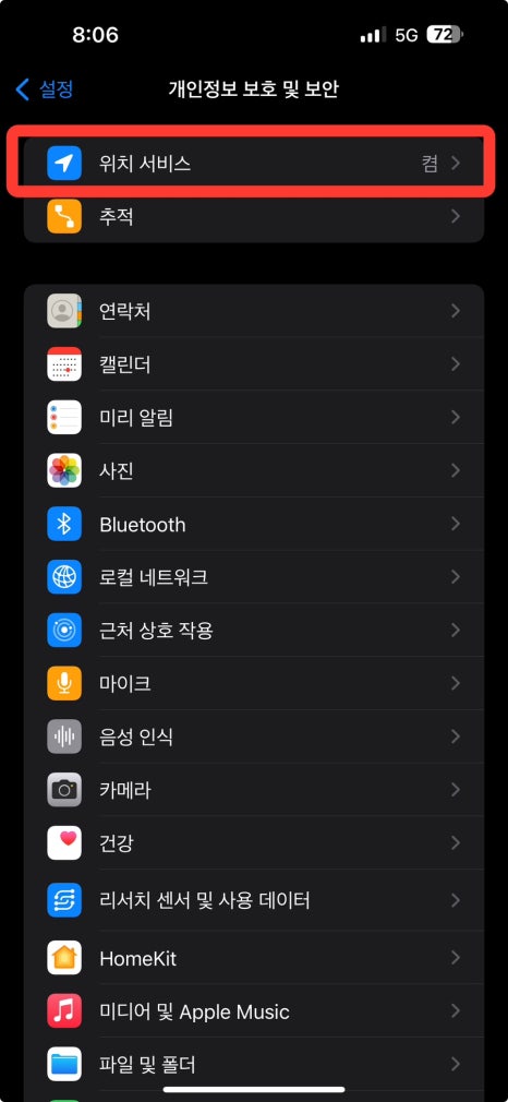 그 개인 정보들 중 위치 서비스를 찾아들어가면 된다.