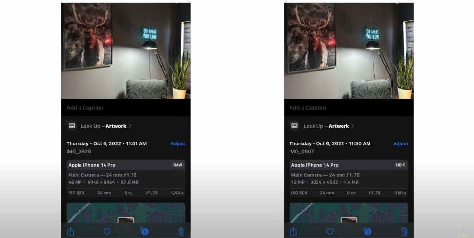 애플의 모든 루머나 정보, 뉴스를 다루는 9to5 MAC에 기고된 사진들을 예로 들어 설명해 보죠. 이 테스트 촬영은 스마트폰의 작은 크기의 센서를 가진 카메라들의 최대 약점인 저조도 환경(어두운)에서 촬영되었으며, JPG와 ProRAW 촬영이 결과물을 비교하고 있습니다.