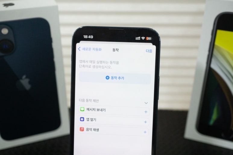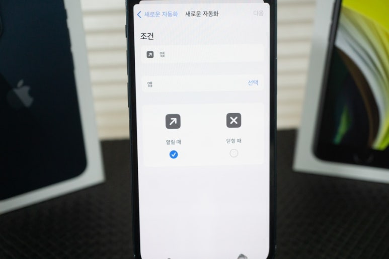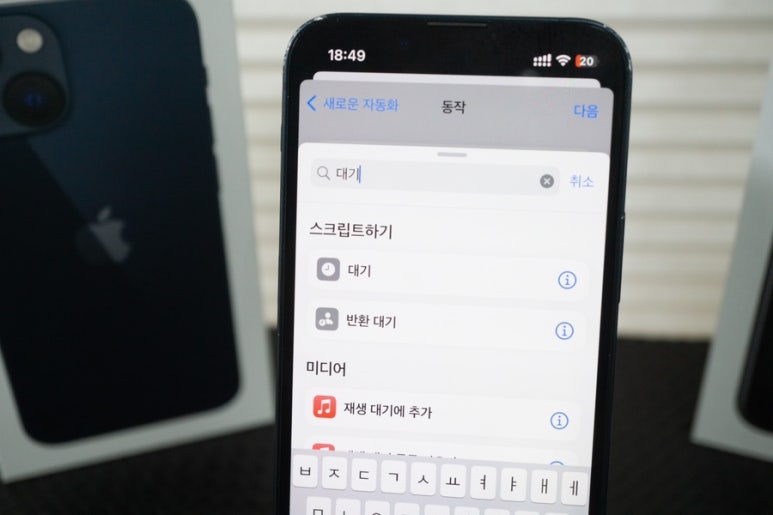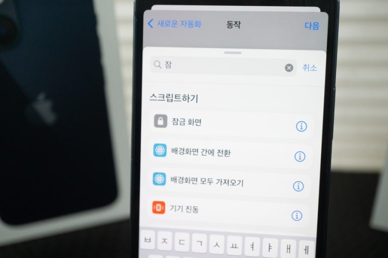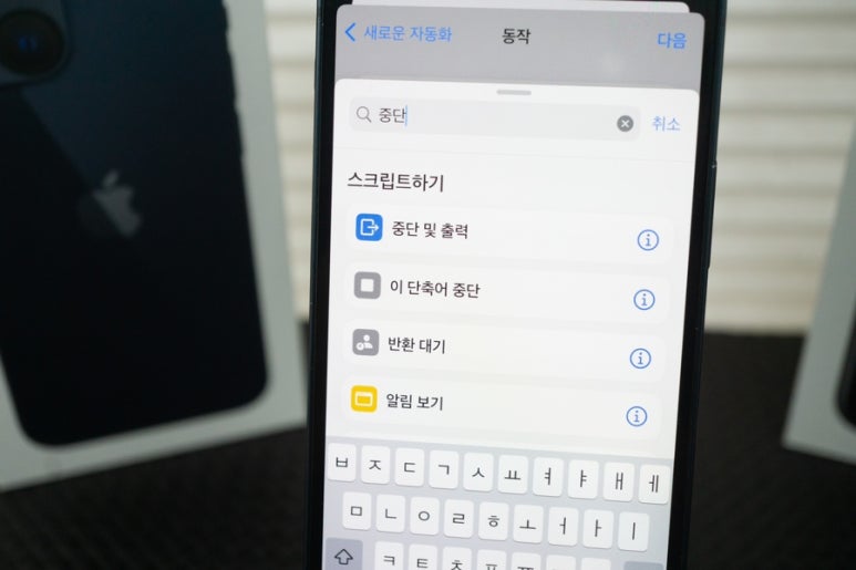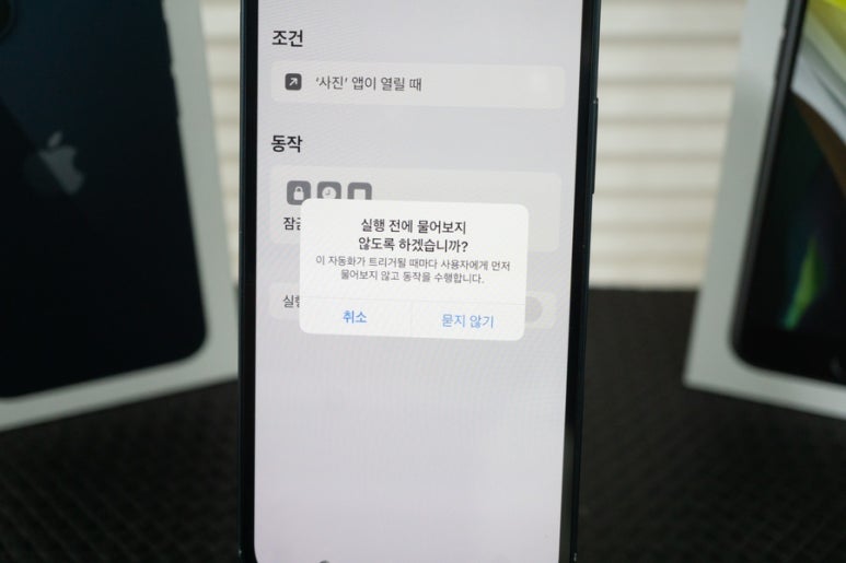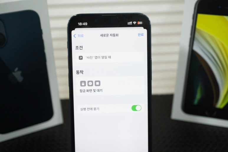 이렇게 아이폰 앨범 잠금 단축어를 자동화 실행하기 위해 맨 처음 실행될 앱을 사진으로 설정하였고 이후 동작에서는 화면 잠그기 - 1초 대기 - 이 단축어 중단으로 이어지게 설정하였습니다.