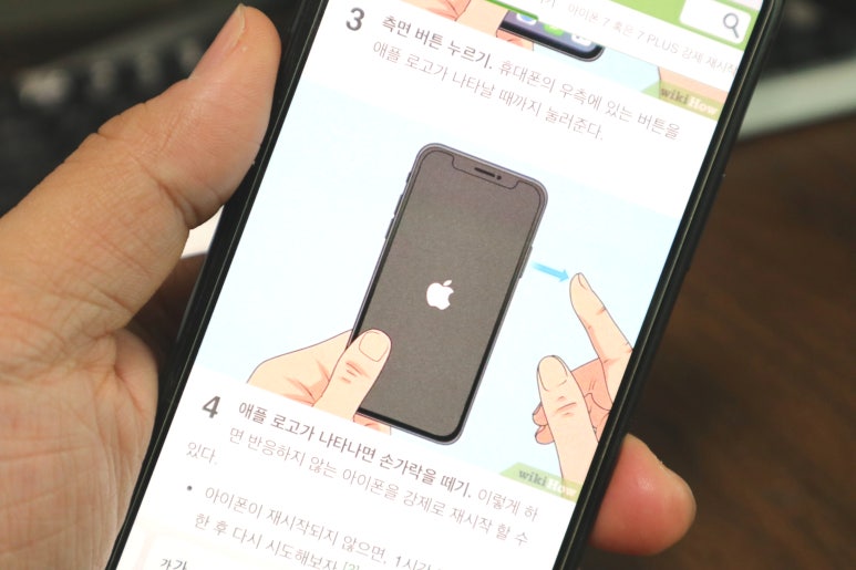 애플 로고가 나타나기 전까지 오른쪽 버튼을 꼭 누르고 있다가, 애플 로고가 나타나면 손을 때면 강제로 핸드폰을 재시작 할 수 있습니다.