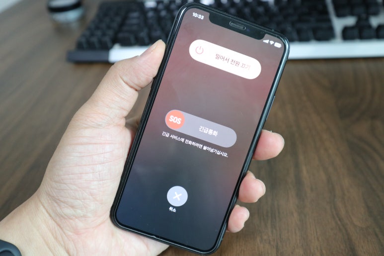 이렇게 1~2초만 누르고 있으면 화면 상단에 나타는 [밀어서 전원 끄기] 버튼을 오른쪽으로 슬라이드 하면 잠시 후 전원이 꺼집니다.