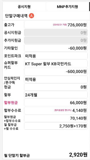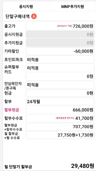 기기 값( 할부원금 )은 66.6만원으로 비싸게 보여집니다.