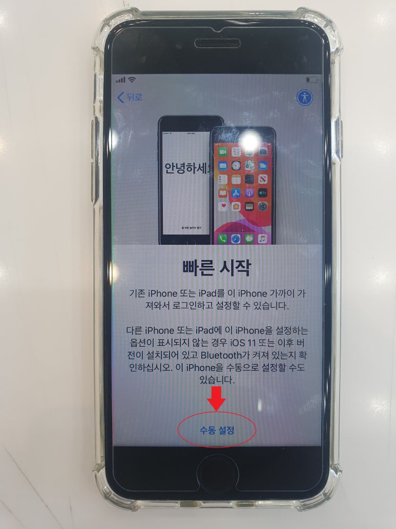 초기 화면에서 언어, 국가 체크 후 '수동 설정' 클릭 ㅡ> 개인정보 보호 동의, Touch ID 생성, 암호생성, 애플 아이디 생성 ㅡ> '3번 사진'에서 대기