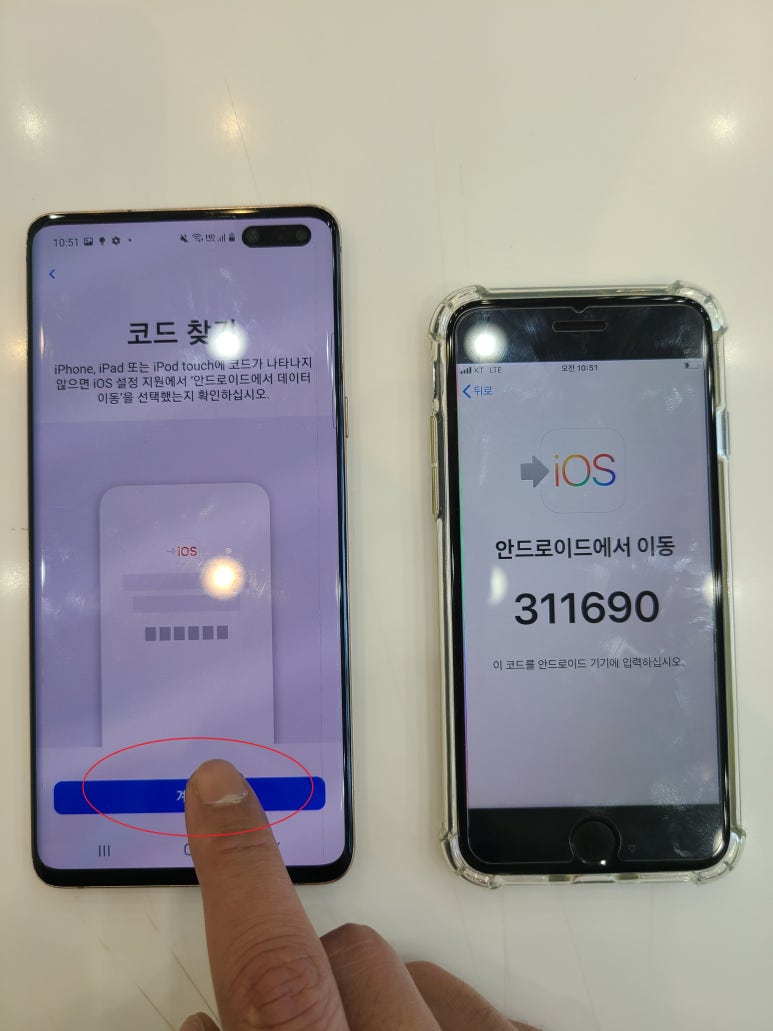안드로이드에서 데이터 이동 ㅡ> 아이폰에서 '계속' 누르기 ㅡ> 삼성폰에서 '계속' 누르기
