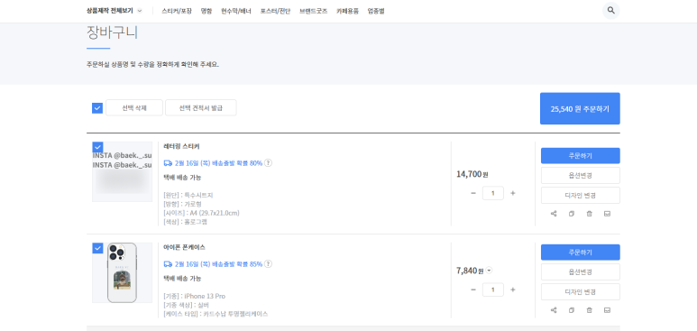 장바구니에 들어가서 제작 내역확인 후 주문하면 제작에 들어간다:D