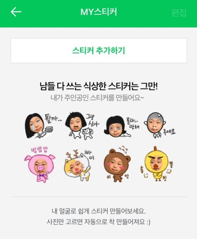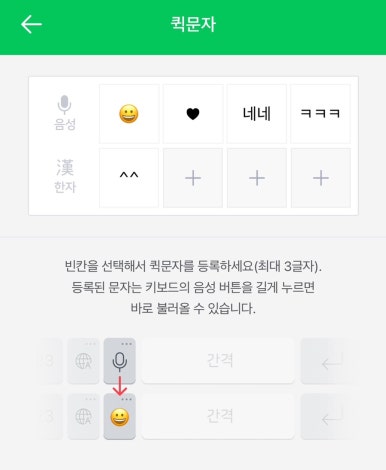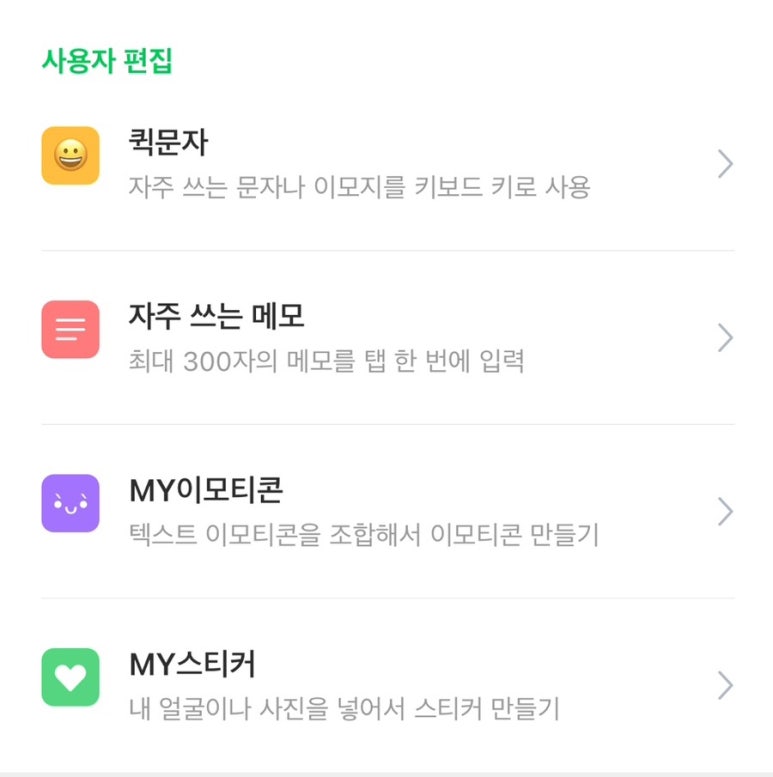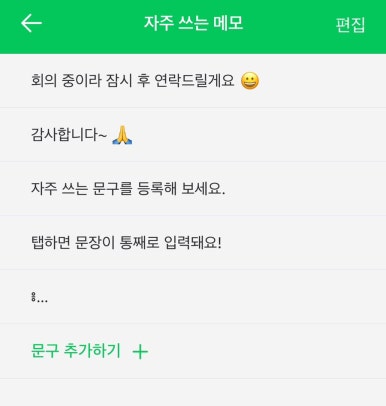 사용자 편집 탭에서는 퀵문자, 자주 쓰는 메모, MY 이모티콘, MY 스티커를 등록해서 사용하실 수 있어요