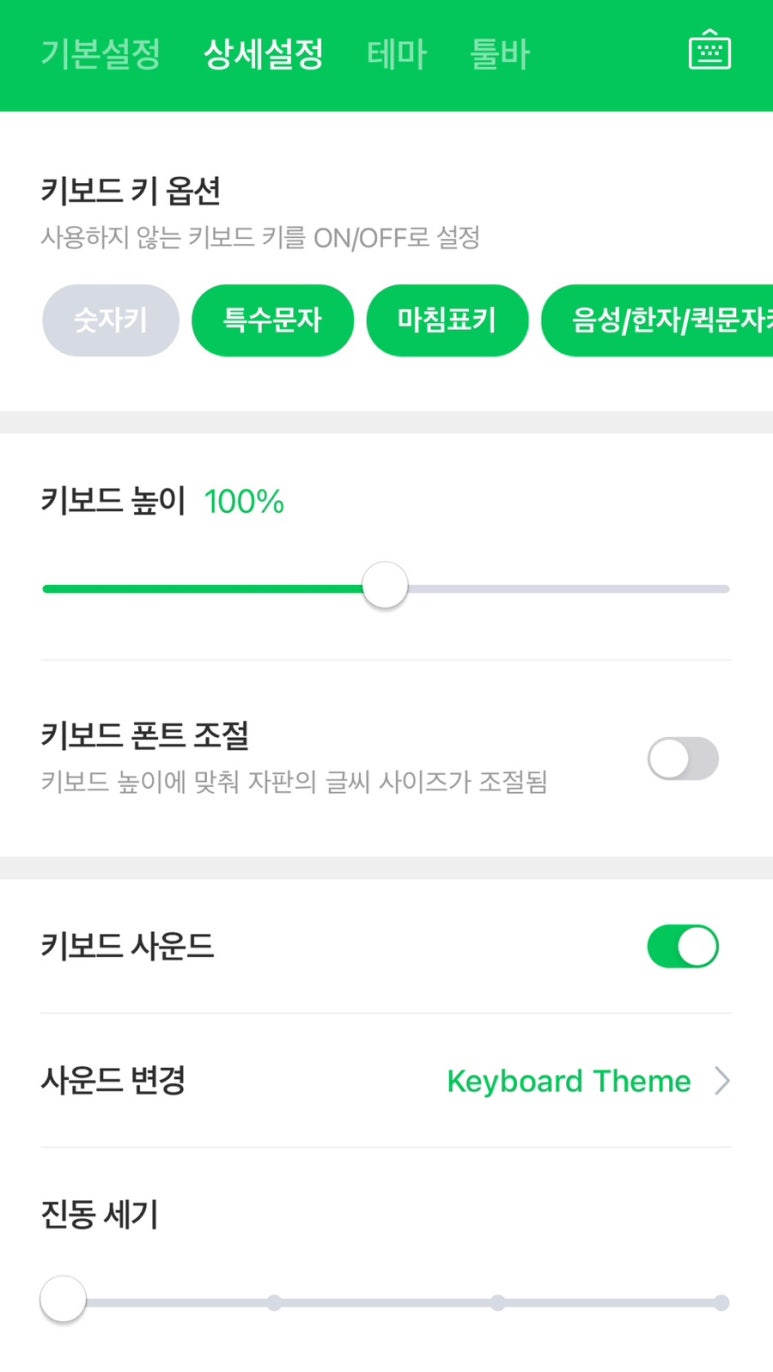 상세 설정 탭에서는 키보드의 키 옵션, 높이, 폰트 조절, 사운드도 설정할 수 있고 텍스트 입력 시에 설정할 수 있는 부분들도 여기서 변경하실 수 있어요