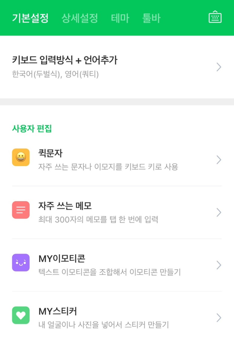 스마트 키보드 앱을 들어가면 처음 기본 설정에서 키보드 입력 방식과 언어 설정을 할 수가 있어요