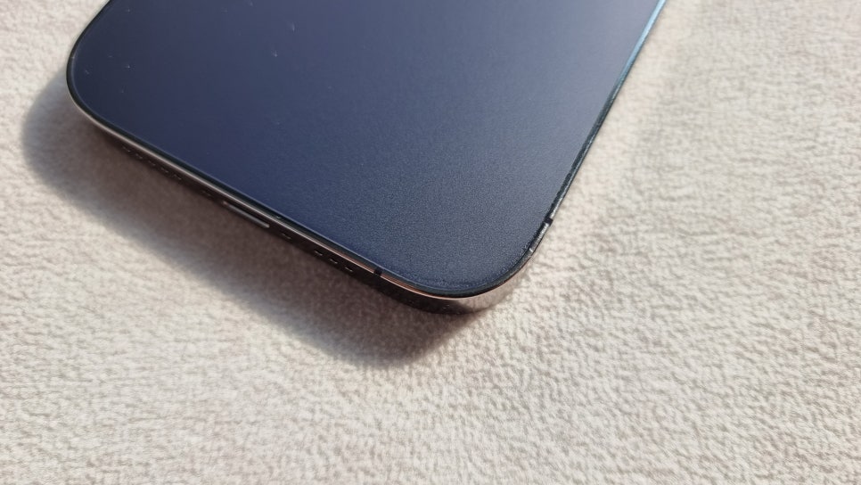 후면 글라스 부분도 크게 흠집이 나거나 파손이 생기진 않았는데, 아래쪽에 바닥에 놓을 때 닿는 부분이 약간 변했습니다. 글라스라 코팅이 벗겨 졌다고 보긴 어렵고 유리가 약간 깨진 느낌이네요. 카메라 테두리 코팅 벗겨짐과 후면 글라스 아래 부분이 약간 변한 것을 제외하면 아이폰 14 프로 후면은 아주 멀쩡합니다.