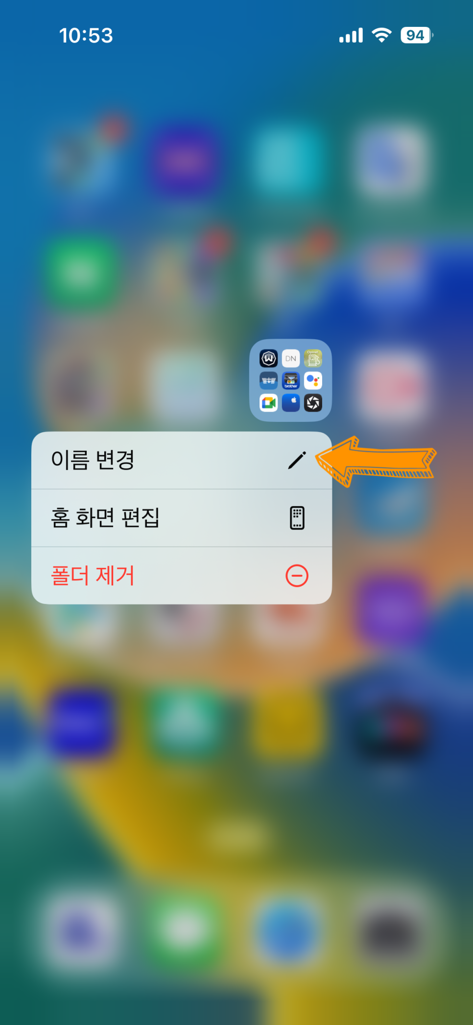 이름 변경, 홈 화면 편집, 폴더 제거와 같이