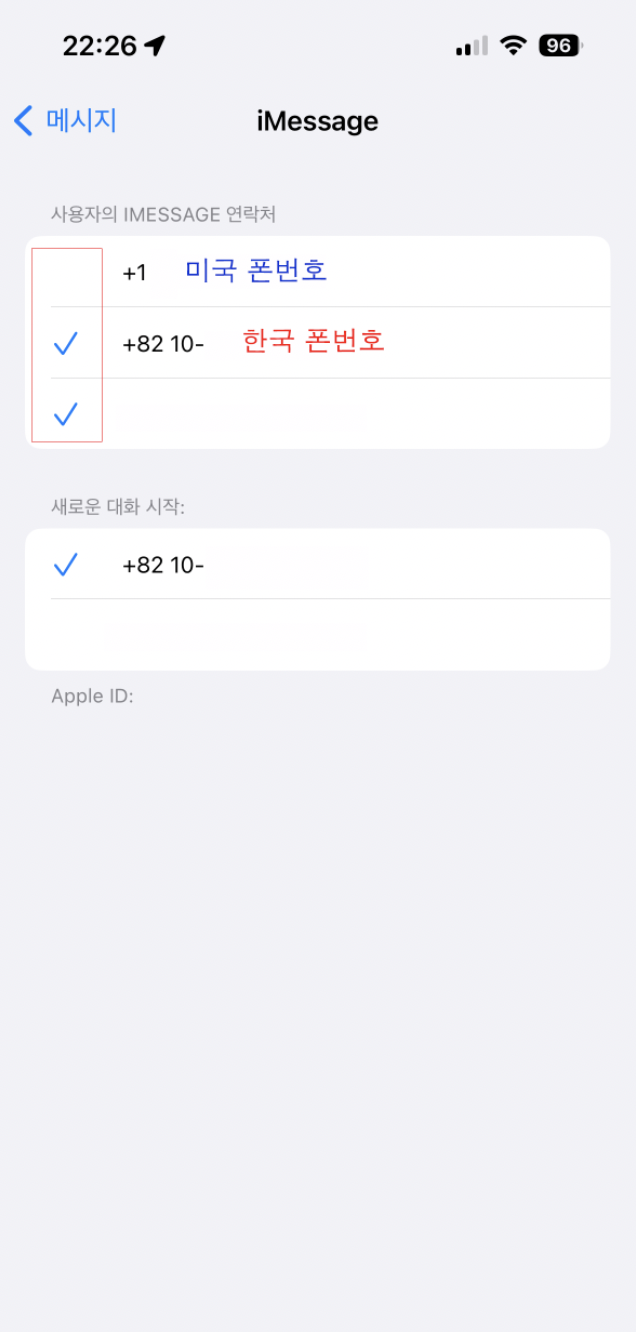 여기서 [사용자의 imessage 연락처]에 외국 폰번호를 한번 눌러서 해제 해준다