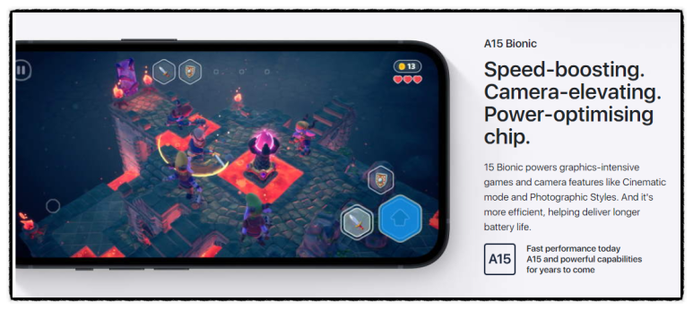 스마트폰의 핵심 기능이라고 할 수 있는 프로세서는 A15 Bionic 칩셋이 탑재가 되어 있는데요. 6-core CPU, 4-core GPU, 16-core Neural Engine으로 크기는 작지만 생각보다 우수한 성능을 보이고 있습니다.