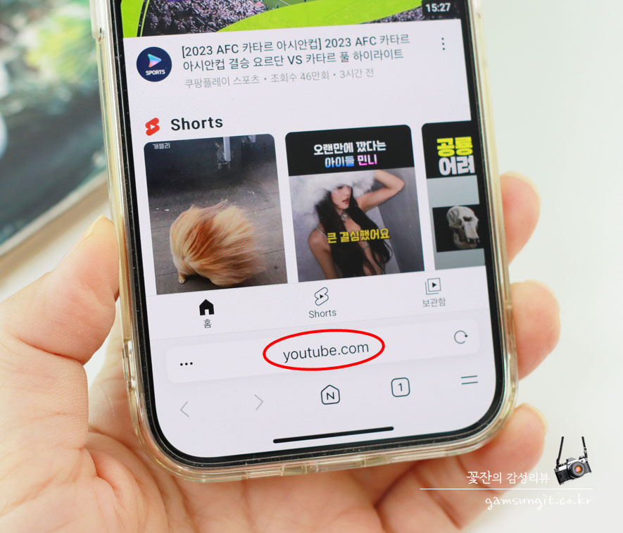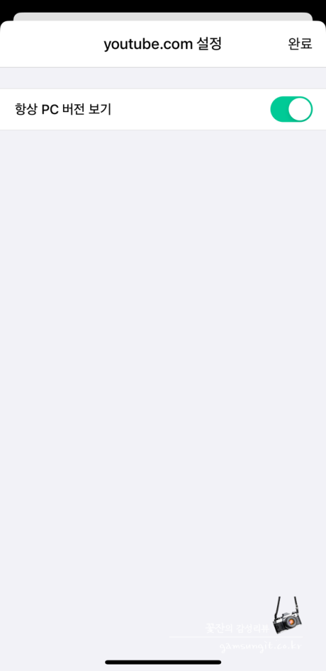 Youtube 실행 화면 하단 주소창 왼쪽 삼점(더보기) 버튼을 누르고 > 웹사이트 설정 > 항상 PC버전 보기 활성화 > 완료 순으로 설정해 주면 됩니다.